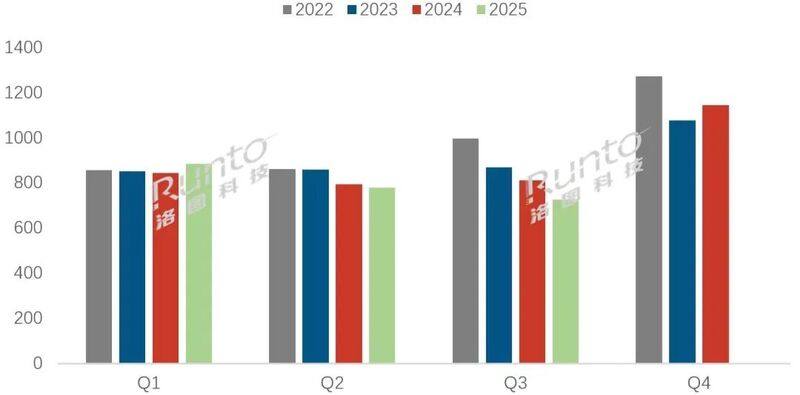 (国内电视市场近四年季度出货量及变化情况(单位/万台),图片来源:洛图科技)